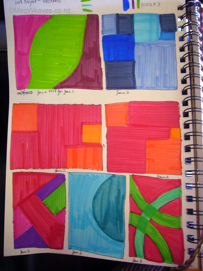 I've done more abstracts, moving into curvy lines. I've been interested in creating movement through color placement and/or shape sizes. This pic is strange because I started with the bottom right square on the right page and moved up, so the big two-parter was finished last.