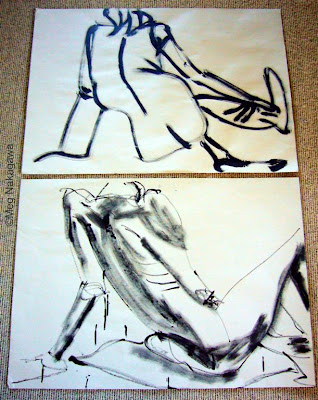 The last two weeks we have been doing "gesture drawings" in wet media using strange tools like sponges, balsa wood pieces, bamboo sticks, feathers, crayon and wash, fat brushes, pieces of sheep skin, etc. Or drawing with our "other" hand. Gesture drawing is liberating because we are to put down the impression of the gesture/pause in a quick motion. We can take forever looking and composing in our heads, but the trick is to move our hands quickly, and without lifting the tool from the surface of the paper if possible. And not looking at the paper while you draw if possible.