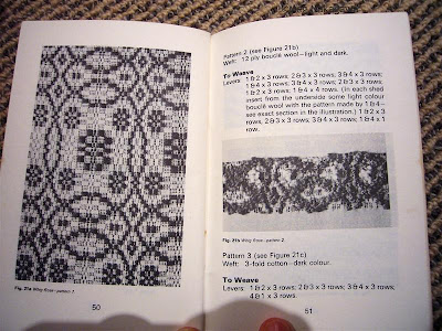 The second is called "Whig Rose" and uses textured yarns. The weaving instruction says, "In each shed insert from the underside some light colored boucle wool made by 1&4..." What do you suppose "insert from the underside" mean? I'm not sure from the photograph, so I'll have to experiment.