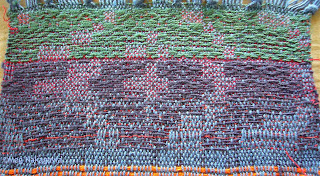 This is my first sample, washed, where I was trying to figure out the color combinations. I was also trying to get used to the borrowed loom, so I lifted only one or two shafts at a time, and you can see with the first color combo, I didn't beat hard enough. The floats are longer than three-ends because of the pointed threading of the tie-down, though not quite the jagged incline I thought I would have at 1.30AM.