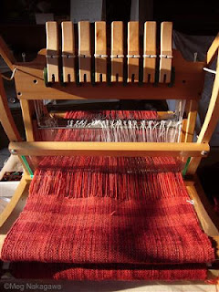 Mom got her second 8-shaft Ashford table loom on Monday and has been busily working on her first, "Leftover Red Wool" project. All yarns used in this project are thrums and other leftovers from past projects, and not only has this been a fast, inexpensive, risk-free project, but also a nostalgic one, every thread reminding her of the pieces she made, people she gifted them to, and in many cases, the two looms she's given away in preference for smaller, lighter ones. She's making two cushion covers. Mom also has two more projects planned, one a pink and blue cotton scarf with rectangular lace windows for herself, and a cashmere scarf for Mrs Suzuki, one of the women who helps her with housework.