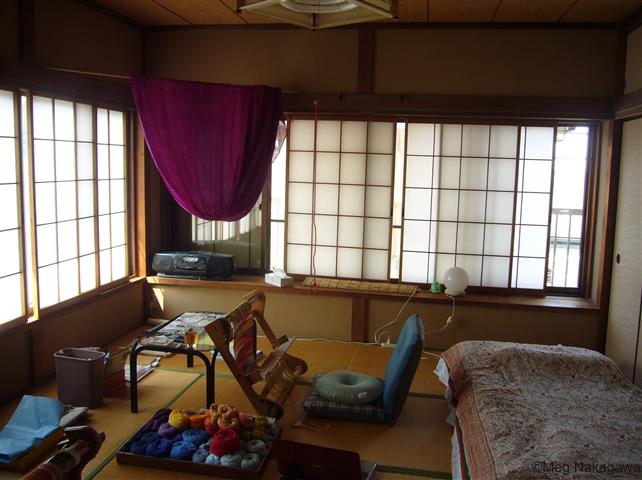 So, my mind has been willing, and my body sometimes. I've reorganized my rooms so I can work with paper easily and not have to put things away at night in my sleeping area, (i.e. shoved the futon to the side,) and most of my weaving/sawing/dye-plan area in the smaller . (Not many weaving blogs will include pics of a badly-made futon, so this could be a World's First? The lump is not a Weiner dog, but a leg pillow Mom made for Dad that's been most comfortable.)