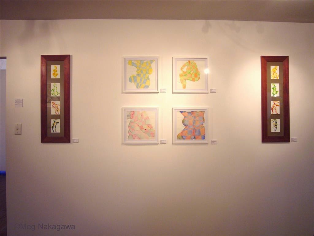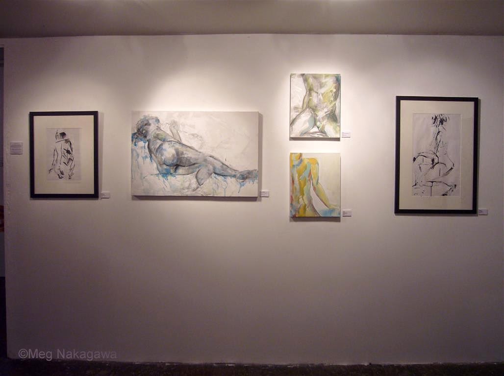 Easy but costly methods like all works in the same colored, same style frame works for larger groups, but fewer constituents and less money prompted us to exercise our imagination. I personally like the clinical look of all white frames, for e.g. but we've seen it before, and in case of Go Figure, we would have lost the immediacy/intimacy of nude gesture drawing, our central theme. I can't remember who came up with the common wall idea, and how to present works; I know it wasn't me and am grateful she did.