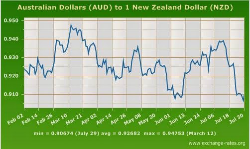 I've already paid for most of my Austrian trip but still need some Oz cash. Watching exchange rates go up and down is a hobby I inherited from Dad; he started when I went to the US during high school. All this year we've been hearing the NZ$ is going to be strong against the Aussie $, culminating in an all time high around August. Well, have a look.