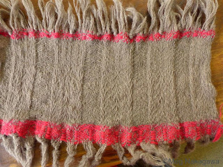 "Bubblegum Ice Cream" (They do exist, though I've ever had any.) I fulled more fully than usual, which deconstructed the bouclé weft, which made this looks messy and a little tired/used, but the fringes are nice. It's a cute, practical piece, and a nice size at 70cm * 188cm and it's mighty good it was woven very large at around 84.5cm in the reed and 2m long.