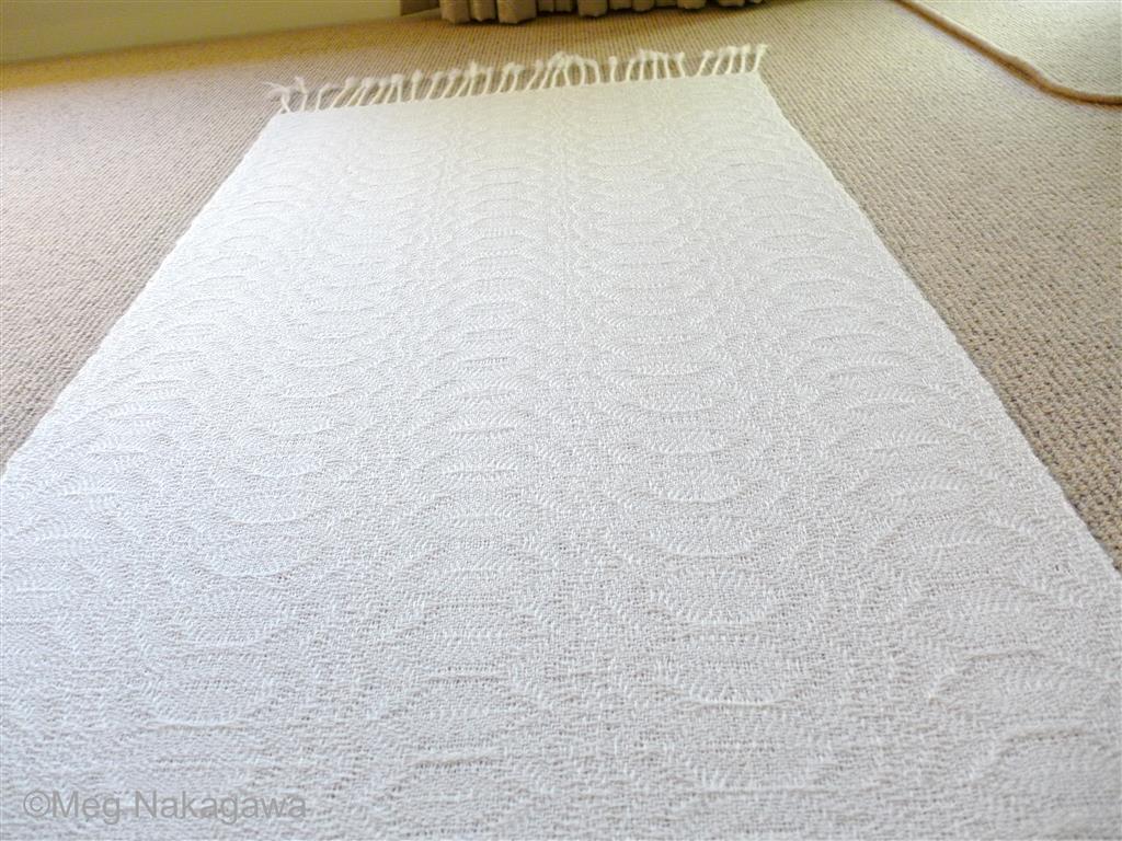White merino/mohair warp, undyed merino-with-scale weft, it's soft and the design is shown by the different sheen, which I like. This is sold and is going to Scotland.