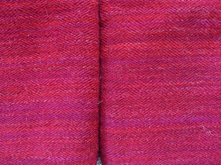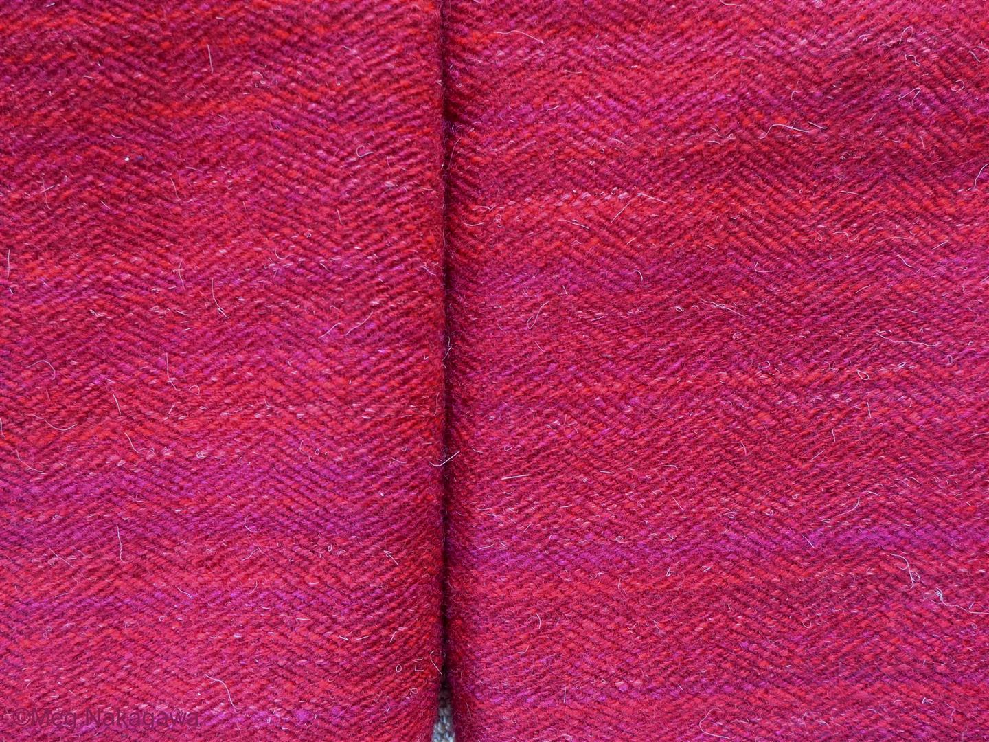 After wet-finishing, Mom's two pieces of fabric weren't as different in softness as when they came off the loom, but different enough we have to rely on the knowledge and skills of her friend who will help Mom design something, and sew it for her. I still like to see a vest with stand collar is nice, but they could up up with a mindblowing geometric something. Who knows.I wove another fabric using a merino bouclé in the weft, thinking it would absorb the different elasticity of the warp yarns. (Both above and below, the red looks to pale and pink; they are saturated deep blue red, deeper than the top pic.) It did; every time I advanced the warp there was a skinny wedge-shaped gap on the right, but after the piece rested off the loom for a couple of days, they were almost invisible; after wet finish, the difference appears to have been absorbed.