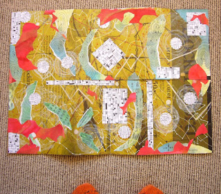 I also found this photo in my camera; a different journal swap with Tess, it's an A2 sheet folded "zine" style in six sections, 12 pages. With the yellows and greens, I was looking for blue pieces of painted paper to unify it, when I saw oh-so-many "Fire and Fury" paper, and used one. Very unlikely color combination for me, but I do like it. This might show up in a weaving some day.