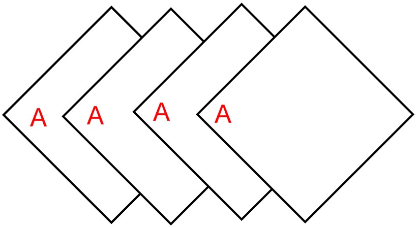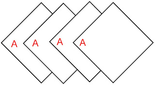 If you glue the sections together with all Corner As on the left or the right side, regardless of top/bottom, the book has a spine/out-side and a fore-edge/in-side. And while the inside or the side towards me has as many independent square pages as the number of sections, (so, four in my swap book,) [Important Part Alert] all of the outside pages are interrelated.