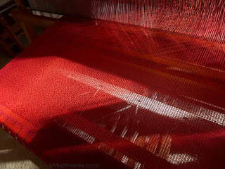 But I remembered saying I'd have another 20/2 color for weft after I finish this piece, which would have been a slightly yellower red, and I knew I talked about the weft selection before, so I checked, and yes, I was weaving with the right yarn, the same red as in the half-width stripes on both sides, but the cashmere/silk mix version.